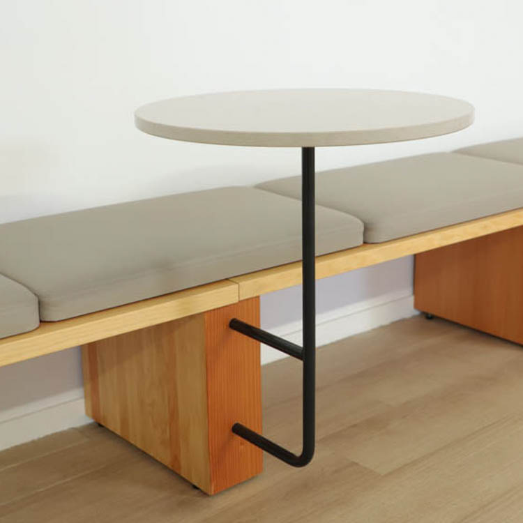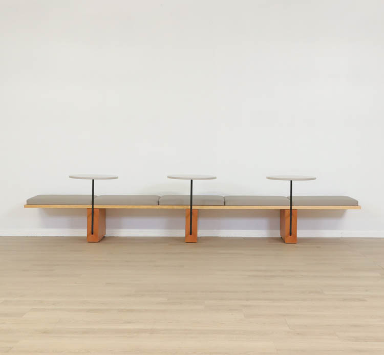 Här presenteras en unik bänk med integrerade bord i vacker marmor som monteras mot en vägg. En perfekt möbel att placera i entréer,väntrum och matsalar eller ytor där man gärna sätter sig för att ta en stunds avkoppling.