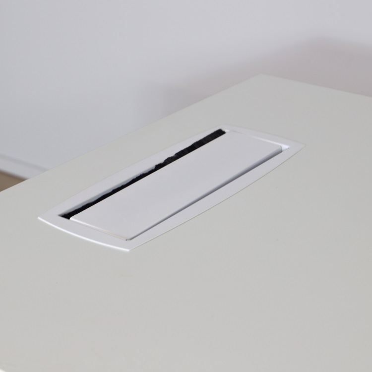 Vitt mötesbord från EFG är den perfekta möbeln att inreda med i mindre rum eller kontor där det enkla möter det funktionella. Bordet skulle tack vare dess nätta form även kunna användas som ett skrivbord vilket också kan vara en fördel för miljöer där det inte finns så mycket uttrymme. Bordet är i helvitt utförande med kabellucka för att gömma undan kablar och dylikt.