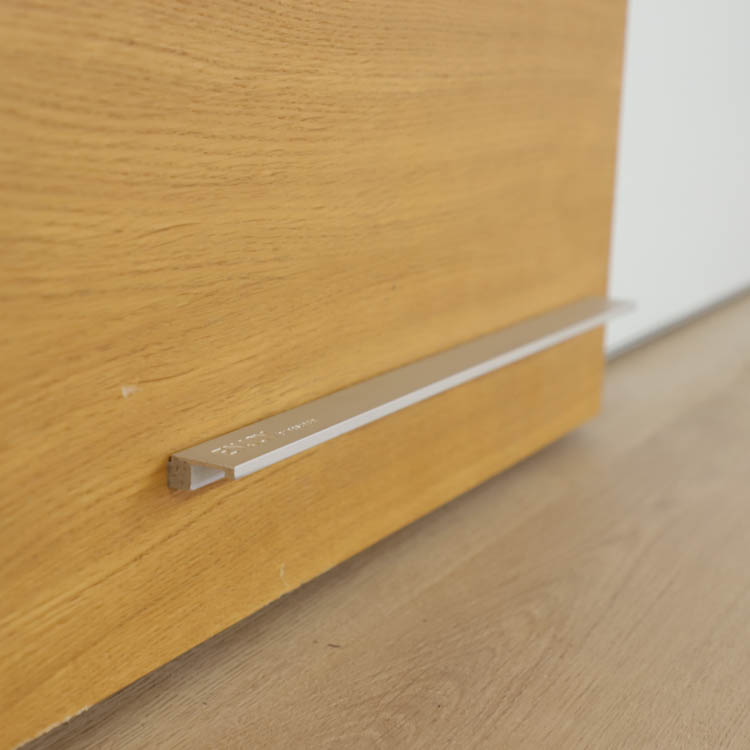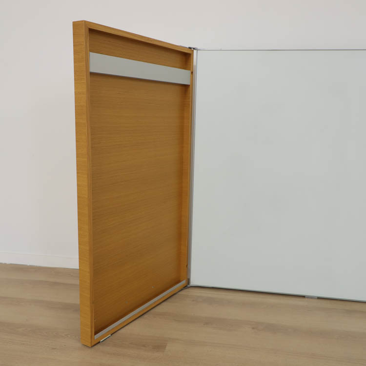 Den tunna ramen och diskreta upphängningslösningen tillsammans med integrerade luckan i trä gör att whiteboarden smälter in i rummet och ger en varm och sofistikerad känsla.